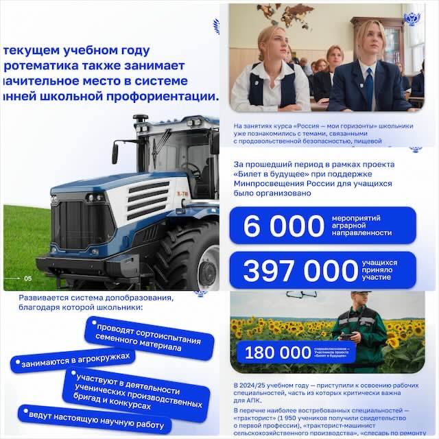 В перечень профориентационных направлений активно входит и профессиональное обучение. По всей стране открыто свыше 1 000 агротехклассов, в которых обучаются более 16 000 школьников. К 2030 их число достигнет порядка 18 000. Ребята получают базовые знания о работе в АПК и углублённо изучают профильные предметы.